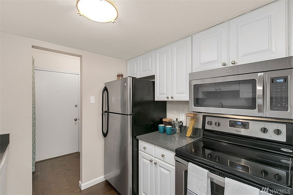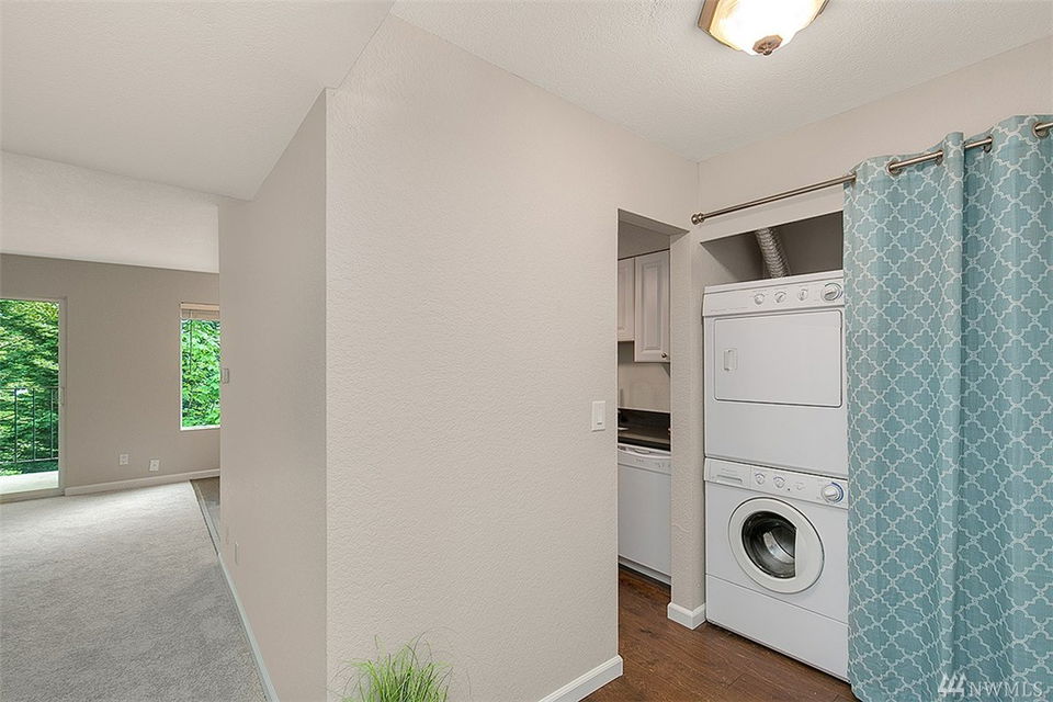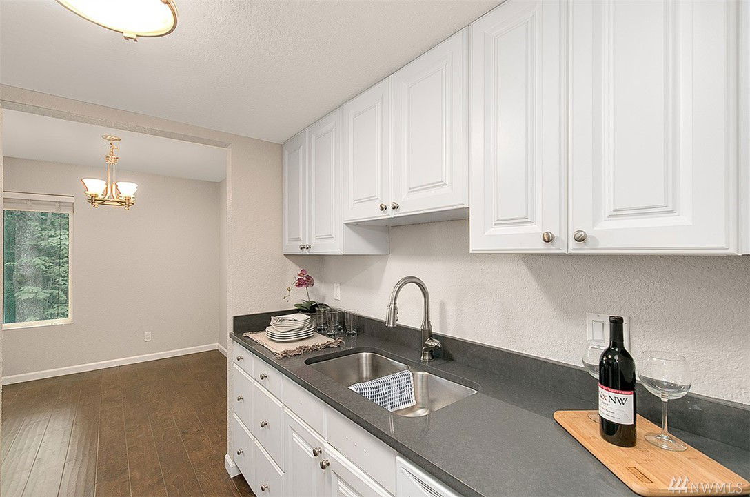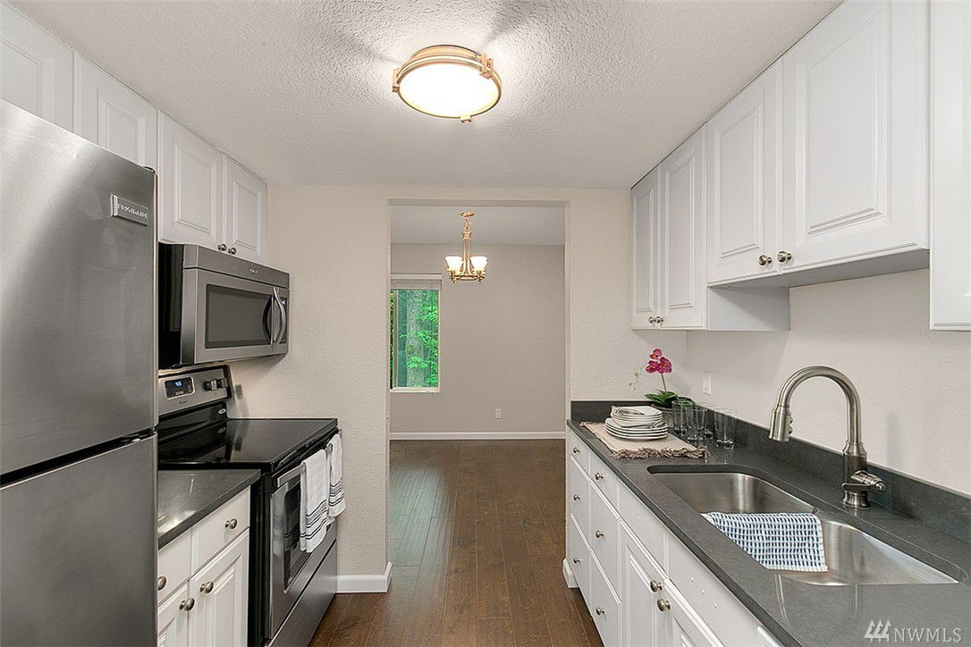 If you like things that shine like new then you just found the home for you! This 100% updated end unit is only a few blocks from the shops & food @ Juanita Village and recently renovated Juanita Beach. Beautiful lake & mountain views in fall & winter are complemented by serene privacy in spring & summer. New finishes: quartz counters, hardwoods, carpet, paint, millwork, plumbing & electrical fixtures, stainless appliances & more. Washer/Dryer in unit! Extra storage on balcony and in basement.
